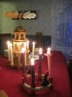 Una corona de Adviento y una pirámide de Navidad adornan una mesa de comedor.