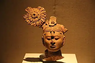 ![]() Escultura con tocado encontrada en Tenam Rosario. | ||