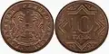 | 10 Tyin | 1993 | Cu+Ni+Zn | 19,56 | 3,48 | Escudo de armas - ҚАЗАҚСТАН РЕСПУБЛИКАСЫ - año de acuñación | 10 ТИЫН - ceca: ҚҰБ | |
