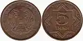 | 5 Tyin | 1993 | Cu+Ni+Zn | 17,27 | 2,26 | Escudo de armas - ҚАЗАҚСТАН РЕСПУБЛИКАСЫ - año de acuñación | 5 ТИЫН - ceca: ҚҰБ | |