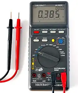 En física e ingeniería, concretamente en electromagnetismo, la tensión o la diferencia de potencial (también denominada voltaje)[1][2] es una magnitud física que cuantifica la diferencia de potencial eléctrico entre dos puntos. También se puede definir como el trabajo por unidad de carga ejercido por el campo eléctrico sobre una partícula cargada para moverla entre dos posiciones determinadas. Se puede medir con un voltímetro.[3] Su unidad en el Sistema Internacional de Unidades (SI) es el voltio, usado como potencia y corriente; a partir de 1990, se utilizaron el efecto Hall cuántico y el efecto Josephson, y recientemente (2019) se introdujeron constantes físicas fundamentales para la definición de todas las unidades SI y unidades derivadas.[4] : 177f, 197f La diferencia de voltaje o potencial eléctrico se denota simbólicamente por , simplificado en V,[5] especialmente en países de habla inglesa o internacional U,[6] por ejemplo, en el contexto de los Ohmios o leyes de circuitos de Kirchhoff.
