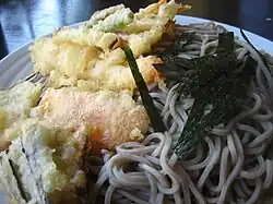 El tensoba o tempura soba es un plato de soba (fideos japoneses) y tempura servidos en un caldo oscuro caliente hecho de dashi, salsa de soja y otros ingredientes. La versión más común es la de soba y tempura de gamba.