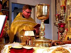 La Eucaristía es un sacrificio en el sentido de que literalmente re-presenta (en el sentido de "hace presente de nuevo") el mismo sacrificio ofrecido por Jesús en la cruz,[30] en el que el sacrificio de Jesús y el sacrificio de la Eucaristía se consideran un único sacrificio; no se considera que la Eucaristía sacrifique a Jesús por segunda vez. La Misa es una representación litúrgica de un sacrificio que hace presente lo que representa mediante la acción de Dios de forma incruenta.[31] La Eucaristía no es una mera conmemoración del sacrificio de Jesús en el Gólgota: también hace verdaderamente presente ese sacrificio. El sacerdote y la víctima del sacrificio son uno y el mismo (Jesús), con la diferencia de que la Eucaristía se ofrece de manera incruenta.[32]