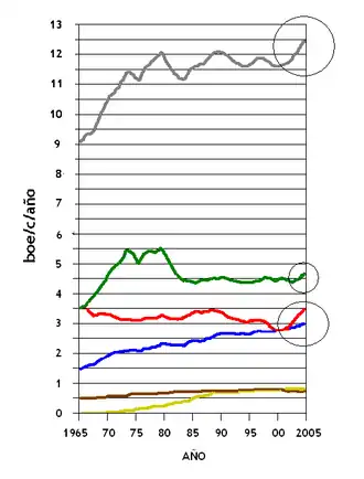 - 2005: Pico de energía per cápita en los países de la OCDE en torno a los 4,75 toneladas equivalentes de petróleo per cápita.[4][31][32][30]