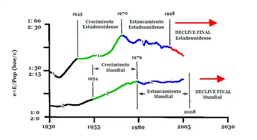 - 1998 en adelante: Etapa de declive final estadounidense, se observa una disminución media del 1,8 % anual de producción de energía per cápita durante el periodo 1998-2005.