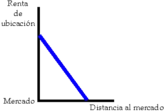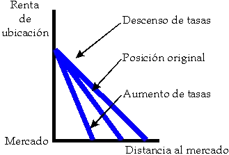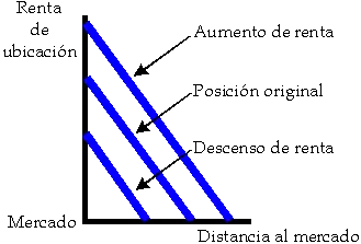 Esto quiere decir que un incremento de la renta; generada bien por el aumento de precio en el mercado, bien por la disminución del coste de producción; provoca un alejamiento de la distancia al mercado, y viceversa.