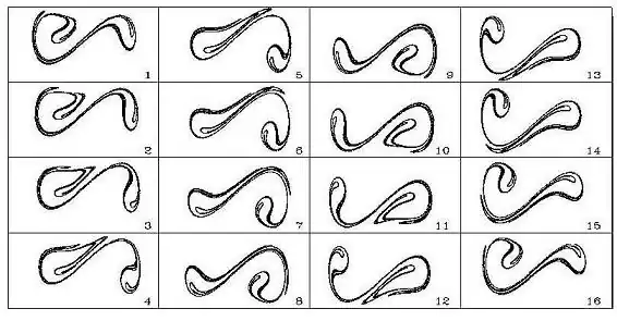 Secciones estroboscópicas del atractor de Duffing: mirando con atención el gráfico, se ve claramente la transformación del panadero. Esto es, se aprecia cómo a la vez que se estira se pliega sobre sí mismo.