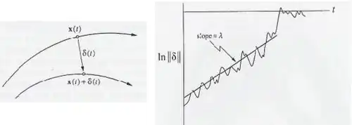 Si se dibuja una gráfica con los ejes y , se observa que para un corto plazo de , la función se mueve alrededor de una pendiente. El valor de esta pendiente equivale al exponente de Lyapunov. Como se observa en el ejemplo de abajo, después de un tiempo la función no continúa cerca de la pendiente. Esto es debido a que, como el atractor está acotado en un espacio del espacio de fases, la distancia no puede aumentar hasta el infinito.