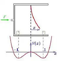 Es fácilmente observable que cuando la varilla está en posición vertical, hay un punto de equilibrio inestable entre dos puntos de equilibrio estables situados simétricamente. El potencial de este sistema es