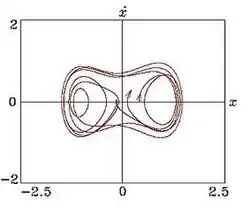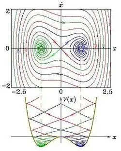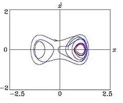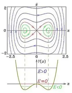 En los mínimos de la energía potencial se observa que los puntos son estables mientras que el máximo corresponde a un punto de silla inestable. Las trayectorias de energía nula son órbitas homoclínicas que se hallan tanto en la variedad estable como en la inestable. Las demás trayectorias corresponden a oscilaciones periódicas cuyas órbitas encierran un solo punto estable () o ambos ().