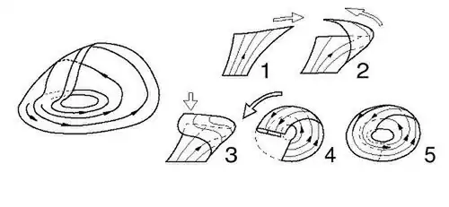 Al repetir infinitas veces el proceso, se logran infinitas capas que le dan al atractor una estructura fractal. Un ejemplo de esto se puede apreciar en el atractor de Rössler. Viendo el gráfico se observa cómo en el número 1 se estira y en el 3 se pliega. Cogiendo el 3 y volviendo a aplicar el proceso, se obtiene el doble de capas.