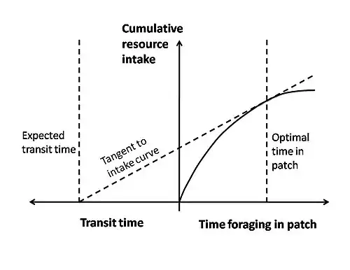 En este modelo, la moneda que se optimiza es generalmente la ganancia de energía neta por unidad de tiempo. Las restricciones son el tiempo de viaje y la forma de la curva de rendimientos decrecientes. Gráficamente, la moneda (ganancia de energía neta por unidad de tiempo) viene dada por la pendiente de una línea diagonal que comienza al comienzo del tiempo de viaje y se interseca con la curva de rendimientos decrecientes (Figura 3). Para maximizar la moneda, uno quiere la línea con la mayor pendiente que aún toca la curva (la línea tangente). El lugar donde esta línea toca la curva proporciona la regla de decisión óptima de la cantidad de tiempo que el animal debe pasar en una parcela antes de irse.
