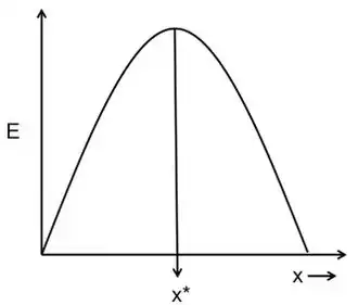 Dadas las hipótesis sobre la moneda y las restricciones, la regla de decisión óptima es la predicción del modelo de cuál debería ser la mejor estrategia de forrajeo del animal.[8] Los posibles ejemplos de reglas de decisión óptimas podrían ser el número óptimo de alimentos que un animal debería llevar a su sitio de anidación o el tamaño óptimo de un alimento en el que un animal debería alimentarse. La Figura 1 muestra un ejemplo de cómo se puede determinar una regla de decisión óptima a partir de un modelo gráfico. La curva representa la ganancia de energía por costo (E) para adoptar la estrategia de forrajeo x. La ganancia de energía por costo es la moneda que se optimiza. Las restricciones del sistema determinan la forma de esta curva. La regla de decisión óptima (x *) es la estrategia para la cual la divisa, la ganancia de energía por costo, es la mayor. Los modelos óptimos de alimentación pueden parecer muy diferentes y volverse muy complejos, dependiendo de la naturaleza de la moneda y la cantidad de restricciones consideradas. Sin embargo, los principios generales de moneda, restricciones y regla de decisión óptima siguen siendo los mismos para todos los modelos.