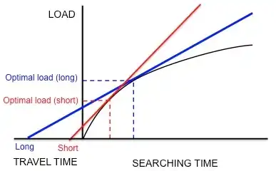 Kacelnik et al. quería determinar si esta especie efectivamente optimiza la ganancia de energía neta por unidad de tiempo, según la hipótesis.[19] Diseñaron un experimento en el que los estorninos fueron entrenados para recolectar gusanos de la harina de un alimentador artificial a diferentes distancias del nido. Los investigadores generaron artificialmente una curva fija de rendimientos decrecientes para las aves al dejar caer gusanos de la harina a intervalos sucesivamente más y más largos. Las aves continuaron recolectando gusanos de la harina a medida que se presentaban, hasta que alcanzaron una carga "óptima" y volaron a casa. Como muestra la Figura 5, si los estorninos estuvieran maximizando la ganancia de energía neta por unidad de tiempo, un tiempo de viaje corto predeciría una carga óptima pequeña y un tiempo de viaje largo predeciría una carga óptima mayor. De acuerdo con estas predicciones, Kacelnik descubrió que cuanto mayor es la distancia entre el nido y el alimentador artificial, mayor es el tamaño de la carga. Además, los tamaños de carga observados se correspondían cuantitativamente con las predicciones del modelo. Otros modelos basados en diferentes monedas, como la energía ganada por energía gastada (es decir, eficiencia energética), no pudieron predecir los tamaños de carga observados con la mayor precisión. Por lo tanto, Kacelnik concluyó que los estorninos maximizan la ganancia de energía neta por unidad de tiempo. Esta conclusión no fue refutada en experimentos posteriores.[20][21]