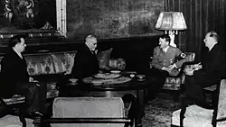 Los nazis encontraron un clima favorable entre la élite iraní para difundir propaganda fascista y racista. La maquinaria de propaganda nazi abogó por la (supuestamente) ascendencia aria común de "las dos naciones". Para cultivar aún más las tendencias racistas, en 1936 el Gabinete del Reich emitió un decreto especial eximiendo a los iraníes de las restricciones de las Leyes Raciales de Nuremberg con el argumento de que eran 'puros- arios de sangre ... En varias publicaciones, conferencias, discursos y ceremonias pronazis, se establecieron paralelos entre Reza Shah, Hitler y Mussolini para enfatizar el parecido carismático entre estos líderes.[66]