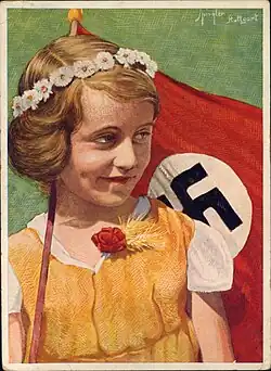La propaganda nazi dirigida a los miembros de las Juventudes Hitlerianas enfatizó la naturaleza "nórdica" de los alemanes, y el texto enviado a todos los miembros de las Juventudes Hitlerianas decía: "el ingrediente principal de nuestro pueblo es la raza nórdica (55%). Eso no quiere decir que la mitad de nuestra gente sean nórdicos puros. Todas las razas mencionadas aparecen mezcladas en todas partes de nuestra patria. Sin embargo, la circunstancia de que la gran parte de nuestro pueblo es de ascendencia nórdica justifica que tomemos un punto de vista nórdico al evaluar nuestro carácter y espíritu, estructura corporal y belleza física".[1] La propaganda nazi afirmaba que los nórdicos debían dominar Alemania, aunque no importaba si eran alemanes que no tenían la apariencia física de la raza nórdica siempre y cuando compartieran los rasgos de ser un "alemán" que se consideraban "valentía, lealtad y honor".[14]