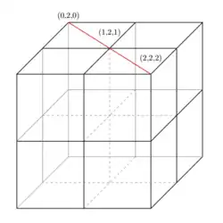 Cada elemento del hipercubo W38 es una sucesión de ocho números del 1 al 3, por ejemplo, 13211321 es un elemento del hipercubo. Estamos asumiendo que este hipercubo está completamente lleno de "ceros" y "cruces". Usaremos una prueba por contradicción y asumiremos que ni el conjunto de ceros ni el conjunto de cruces contienen una línea combinatoria. Si fijamos los primeros seis elementos de dicha sucesión y dejamos que los dos últimos varíen, obtenemos una tablero de tic-tac-toe ordinario, por ejemplo 132113 ?? da tal tablero. Para cada uno de estos tableros abcdef ??, consideramos las posiciones abcdef11, abcdef12, abcdef22. Cada uno de estos debe ser llenado con una "cero" o una "cruz", por el principio de casillero dos de ellos deben llenarse con el mismo símbolo. Dado que dos de estas posiciones son parte de una línea combinatoria, el tercer elemento de esa línea debe estar ocupado por el símbolo opuesto (ya que asumimos que ninguna línea combinatoria tiene los tres elementos llenos con el mismo símbolo). En otras palabras, para cada elección de abcdef (que se puede considerar como un elemento del hipercubo de seis dimensiones W36), hay seis posibilidades (superpuestas):