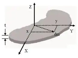 Trabajando en coordenadas cartesianas, el momento de inercia del cuerpo plano sobre el eje está dado por:[3]