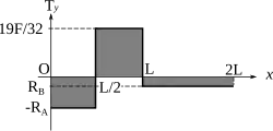 Esfuerzos cortantes para viga de tres apoyos con una carga puntual. Los saltos en el diagrama coinciden con las reacciones.