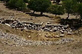 La ciudad estaba rodeada de murallas, cuyo trazado puede seguirse en toda su extensión. En la acrópolis se han encontrado algunos restos de murallas. En la ciudad baja, la muralla encerraba un área de unos 0,5 km2 . Sus murallas datan del período helenístico y se remontan al siglo I a. C.. En la ciudad baja se encontraba el ágora, lugar de comercio y reunión. En su esquina norte se han encontrado los restos de un buleuterio, o lugar de reunión del consejo.[2][3][22]