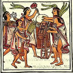Un dibujo del Códice florentino del siglo XVI que muestra una ceremonia de Una Flor con un teponaztli (primer plano) y un huehuetl (fondo)