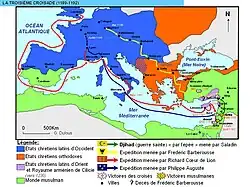 Tras el fracaso de la segunda cruzada (1147–1149), la dinastía Zenguí controló una Siria unificada e inició un conflicto con los gobernantes fatimíes de Egipto, que finalmente dio lugar a la unificación de las fuerzas egipcias y sirias bajo el mando de Saladino, que los empleó para reducir la presencia cristiana en Tierra Santa y recuperar Jerusalén en 1187. Estimulados por el celo religioso, Enrique II de Inglaterra y Felipe II de Francia pusieron fin a su conflicto para liderar una nueva cruzada, aunque la muerte de Enrique en 1189 dejó a los ingleses bajo el gobierno de Ricardo Corazón de León. El anciano emperador del Sacro Imperio Romano Germánico Federico Barbarroja respondió a la llamada a las armas y lideró un ejército poderoso a través de Anatolia, ganando algunas victorias contra el Sultanato selyúcida de Rum, pero se ahogó antes de llegar a la Tierra Santa. Muchos de sus soldados desanimados volvieron a sus casas.