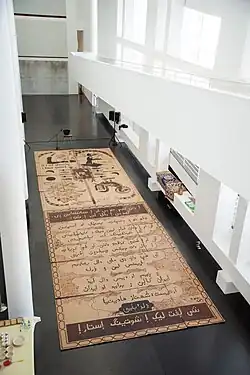 “Baharestan Carpet”, creada en 2017-2018, es una alfombra de cartón. “Baharestan”, puede traducirse como “lugar de la primavera”, y es también el nombre más utilizado en Teherán para designar la legendaria alfombra que adornaba el palacio de Ctesifonte (4). Su diseño representa un jardín dividido en cuatro partes en torno a cuatro temas: la literatura persa, la mitología, la historia política de Irán y el lugar de la mujer (4).