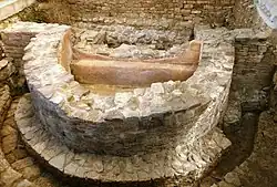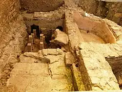 Las excavaciones que se llevaron a cabo a principios del siglo XXI descubrieron un conjunto termal datado a finales del siglo I, muy empleado por los romanos. Las excavaciones ocupan un área de 46 m². En ella se ven claramente diferenciadas dos zonas: el caldarium, también llamado calidarium, cella caldaria o cella coctilium, y el tepidarium. El primero está dividido por un muro de la fachada sur del templo.[1]