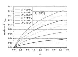 La figura de al lado muestra la evolución del rendimiento de conversión de un sistema termoeléctrico en las condiciones ideales en función del factor de mérito ZT. Por ejemplo, si ZT=1 y la diferencia de temperatura es de 300 °C, el rendimiento de conversión será del 8%, lo que significa que según el caso considerado (generación de electricidad o refrigeración) que el 8% del calor que atraviesa el material será convertido en electricidad, o bien que el calor extraído por el elemento refrigerador corresponderá al 8% de la potencia eléctrica empleada.