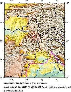 El Terremoto de Afganistán de octubre de 2009 fue un terremoto de 6,2 en la escala de magnitud de momento, que se produjo en el este de Afganistán el 23 de octubre de 2009, a las 00:21 hora local.[1]
