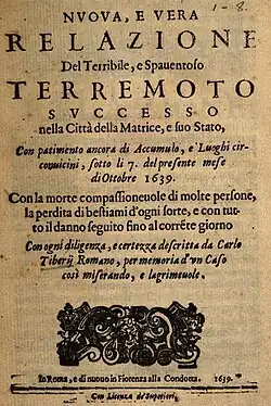 - ↑ a b c d Carlo Tiberi Romano (1639). Nuova, e vera relazione del terribile, e spaventoso terremoto successo nella Città della Matrice, e suo Stato, Con patimento ancora di Accumulo, e Luoghi circonvicini, sotto li [7] del presente mese di ottobre 1639 (en italiano). Roma.