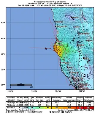 Este ha sido el terremoto más fuerte en California desde los sismos de Ridgecrest en 2019 y el más intenso en la costa noroeste del estado desde 2005.[6] Personas tan lejanas como en Phoenix, Arizona, y Vancouver, Canadá, sintieron el temblor. Hasta las 4:47 p. m. (PT) del 5 de diciembre de 2024, se habían registrado 83 réplicas.[3]