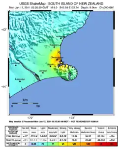 El terremoto de Christchurch de junio de 2011 fue un terremoto de una magnitud de 6,3 ML[4] que se produjo en Nueva Zelanda el 13 de junio de 2011 a las 14:20 NZST (02:20 UTC). Se ubicó a una profundidad de 6 km, a unos 10 km de Christchurch, que previamente había sido devastada por otro terremoto de magnitud 6,3 ML en febrero de 2011. El terremoto de junio fue precedido por un temblor de magnitud 5,9 ML que azotó la región con un hipocentro de 8,9 km. El Servicio Geológico de Estados Unidos reportó una magnitud de 6,0 Mw, a una profundidad de alrededor de 9 km.