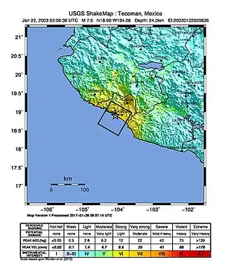 El terremoto de Colima de 2003 fue un sismo ocurrido a las 20:06:34 hora local (02:06:34 UTC) del 21 de enero de 2003, frente a las costas del estado de Colima, en el oeste de México. El terremoto alcanzó una magnitud de 7,6 (MW), aunque otras instituciones estimaron diversas magnitudes que van desde 7.7,[1] 7.8, y 8.0 (MW).[2] Todo el estado y algunas zonas de Michoacán y Jalisco fueron afectadas por el sismo.