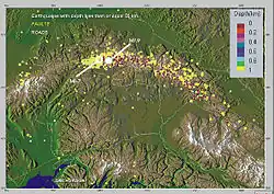 La ruptura inicial del 3 de noviembre estaba en un segmento de la falla en el glaciar Susitna al sur de la falla de Denali.[5][6]