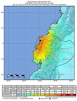 El terremoto de Ecuador de 2016 fue un sismo altamente mortífero que ocurrió a las 18:58:37 hora local (UTC-5) del sábado, 16 de abril de 2016, con epicentro entre las parroquias Pedernales y Cojimíes del cantón Pedernales, en la provincia ecuatoriana de Manabí.[1] Con una magnitud Mw = 7,8,[6] constituye el sismo más fuerte sentido en el país desde el terremoto de Colombia de 1979, el más destructivo desde los terremotos de Ecuador de 1987[7] y el cuarto más grande (en magnitud) de 2016. Las ondas sísmicas llegaron al suroccidente de Colombia, sintiéndose en ciudades de ese país como Tumaco, Cali, Pasto, Popayán, Neiva, Bogotá y a la frontera norte de Perú, en regiones como Tumbes, Piura, Cajamarca, Lambayeque y Amazonas.[8] También fue percibido en países tan lejanos como Venezuela y Panamá.