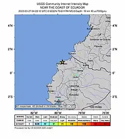 - ↑ a b «Sismo en Ecuador: un muerto, 42 viviendas destruidas y cientos de damnificados tras temblor de magnitud 6».