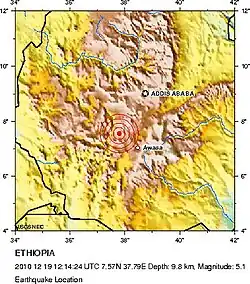 El terremoto de Etiopía de 2010 fue un sismo de 5,1 grados en la escala de magnitud de momento[1] y se produjo en el centro-sur de Etiopía el domingo 19 de diciembre de 2010 a las 15:14 hora local (12:14 UTC). Su epicentro estuvo localizado a 95 kilómetros al noroeste de la ciudad de Awasa y a 190 al sursudoeste de Adís Abeba, la capital etíope. A causa de este sismo fueron reportadas al menos 19 personas heridas y un número indeterminado de viviendas con algún tipo de derrumbe lo que hizo que se decretara la alerta naranja.[2][3]