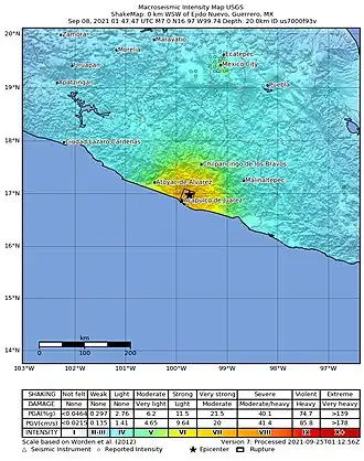 El terremoto de Guerrero de 2021 sucedió a las 20:47:46 CST (2021-09-08 01:47:46 UTC) el 7 de septiembre del 2021 con una magnitud de 7.0 según el Servicio Geológico de Estados Unidos[4] o 7.1Mw según el Servicio Sismológico Nacional.[5] Su epicentro fue en el estado de Guerrero, a 11 km al suroeste de Acapulco de Juárez.[5] Fue un terremoto de falla de cabalgamiento ubicado en o cerca del límite de la zona de subducción de la placa norteamericana y la placa de Cocos; ocurrió en la extensión sur de la Brecha de Guerrero. El terremoto mató a 14 personas e hirió al menos a otras 23. Al menos 1.6 millones de personas en México se vieron afectadas por el terremoto que resultó en daños severos localizados. Es el terremoto más grande desde el terremoto de Oaxaca de 2020 que tuvo una magnitud estimada de 7.4Mw[5] y el más mortífero desde el terremoto de Oaxaca de 2018 que mató indirectamente a 14 personas.[6]