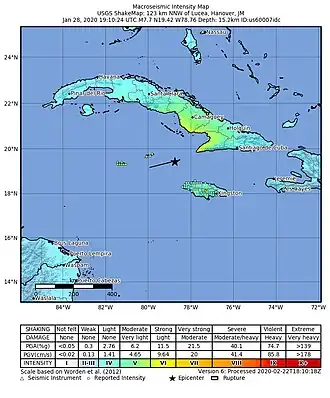 El terremoto fue de Magnitud 7.7 (Magnitud de Momento) y se registró 28 de enero de 2020 en el mar Caribe al sur de Cuba y al noroeste de Jamaica se produjo como resultado de una falla por deslizamiento en el límite de la placa entre las placas tectónicas Norteamericana y del Caribe.[2]
