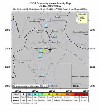 | Coordenadas del epicentro | 24°18′12″S 64°25′01″O / -24.30333333, -64.41694444 | |