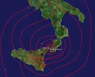 El lunes 28 de diciembre de 1908, a las 05:20, se produjo un terremoto de 7,1 en la escala de magnitud de momento. Su epicentro se situó en el estrecho de Mesina, que separa la concurrida ciudad portuaria de Mesina en Sicilia y Regio de Calabria en la Italia continental. Su epicentro preciso se ha localizado en la zona norte del mar Jónico, cerca de la parte más angosta del estrecho, donde se encuentra Mesina.[4]​ Tuvo una profundidad de 8-10 km (5-6 millas).