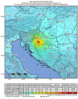A las 12:19 p.m. CET (11:19 UTC) del 29 de diciembre de 2020, un terremoto de magnitud 6.4Mw, 6.2ML, golpeó el condado de Sisak-Moslavina, Croacia, con un epicentro a 3 km (1.8 millas) al oeste-suroeste de Petrinja. La intensidad máxima del fieltro se estimó en VIII (muy dañino) a IX (destructivo) en la escala macrosísmica europea. Antes de este evento hubo tres sismos, el más fuerte de los cuales tuvo una magnitud de 5,2 Mw el día anterior. Al terremoto le siguieron numerosas réplicas, la más fuerte de las cuales tuvo una magnitud de 4,8 Mw.[1]