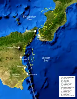 Sicilia se encuentra en parte del complejo límite convergente donde la placa africana se subduce debajo de la placa euroasiática. Esta zona de subducción es responsable de la formación del estratovolcán Etna y de una considerable actividad sísmica. Sin embargo, los terremotos más dañinos ocurren en la zona de fallas Siculo-calabrés. Esta zona de fallas extensionales se extiende por unos 370 kilómetros (229,9 mi), formando tres segmentos principales a través de Calabria, a lo largo de la costa este de Sicilia e inmediatamente en alta mar, y finalmente formando el margen sureste de la meseta ibláica. Las fallas en el segmento calabrés fueron responsables de la secuencia de terremotos de Calabria de 1783.[7]