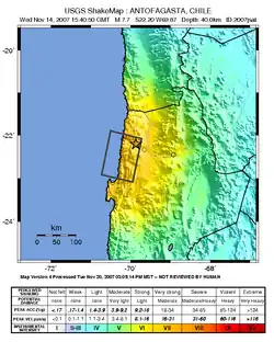 - ↑ USGS. «Magnitud 7.2 ANTOFAGASTA, CHILE». Archivado desde el original el 18 de diciembre de 2007. Consultado el 16 de diciembre de 2007.