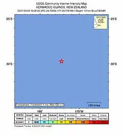 - ↑ «M 8.1 - Kermadec Islands, New Zealand, Shakemap». USGS (en inglés). 5 de marzo de 2021. Consultado el 7 de marzo de 2021.