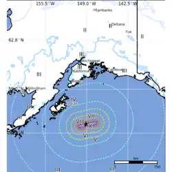 Inicialmente se estimó como un evento de magnitud 8.2, pero luego fue degradado por el Servicio Geológico de los Estados Unidos.[2] El terremoto se sintió en la mayor parte del sur de Alaska, incluidas las principales ciudades de Anchorage y Fairbanks, y partes de la vecina Columbia Británica.[3][4]