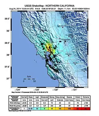 El terremoto de Napa de 2014 fue un terremoto ocurrido a las 03:20 hora local (10:20 UTC) del domingo 24 de agosto de 2014, que alcanzó una magnitud de 6,0 (MW).[1] Según el USGS, el epicentro se localizó a 9 kilómetros al sudoeste de la ciudad de Napa al norte de la ciudad de San Francisco, Estados Unidos. El sismo se ubicó a una profundidad de 11,2 km bajo la corteza terrestre. Fue el temblor más fuerte en la Bahía de San Francisco desde el terremoto de Loma Prieta en 1989.