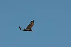 Si bien algunos machos territoriales son remplazados durante la temporada reproductiva, la enorme mayoría de ellos obtiene una parcela por primera vez al ocupar el lugar de un anterior residente que no haya sobrevivido al invierno.[nota 3][24] Asimismo, los machos pueden establecerse en dominios ya ocupados a través de un proceso gradual y persistente que implica una serie de conductas. El recién llegado vuela bajo sobre algún territorio ajeno moviendo las alas lentamente, alternando planeos y batimientos alares. A veces, mientras planea sobre la parcela, mira hacia atrás sobre el hombro hacia el propietario. Como intentando ponerlo a prueba, vuela constantemente en dirección al macho territorial provocándolo a perseguirlo y, cuando esto sucede, se retira o lo evita y vuela en círculos sobre el territorio, cambiando de velocidad y a veces planeando. De esta manera, el intruso conduce al residente más y más alto, siempre en círculos, a veces hasta que alcanzan varias decenas de metros y en ocasiones lejos de la parcela. A menudo, durante el vuelo, el retador picotea al propietario y viceversa. El macho territorial intenta mantenerse sobre el otro, alternadamente planeando y volando coordinadamente con él, hasta que uno u otro logra separarse. Luego el intruso vuela a otro lado o bien de regreso al territorio y el vuelo comienza nuevamente. Los machos nuevos pueden desafiar a varios residentes o incursionar en sus dominios como intentando encontrar un oponente adecuado. Varios individuos pueden perseguir simultáneamente a un recién llegado desafiante.[4]