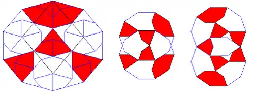 En 1996 la matemática alemana Petra Gummelt demostró que un equivalente de cubrimiento a la teselación de Penrose podría ser construida al cubrir el plano con una baldosa simple decagonal[8] si dos tipos de superposición eran permitidos. Este nuevo enfoque se denomina 'cubrimiento' para distinguirla de la 'teselación' no superpuesta. La teselación decagonal es decorada con figuras coloreadas y la regla de cubrimiento permite solo la superposición de estas decoraciones.